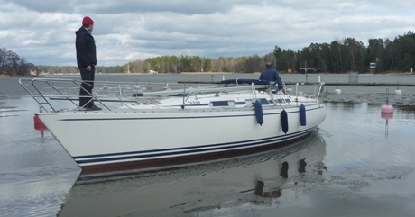 I Amiralshamnen har man "alltid" sjösatt första gången i slutet av april! Så då gör man ju det alltid av sed och ohejdad vana! Amiralen huttrar av bara tanken och t.o.m. i mastskjulet där masten fick sitt nya storfall och topptrissan! Här åker familjen Webers nyförvärv ner bland isflaken. I bakgrunden kan man se isen utanför hamnen.