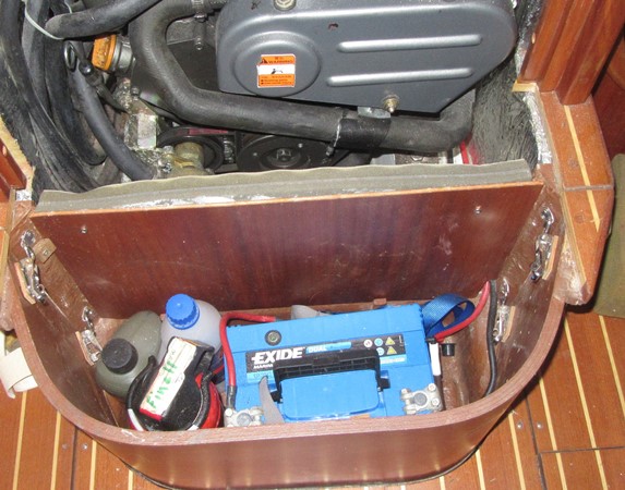 Det lilla Litium startbatteriet är under kojen akter om motorn!